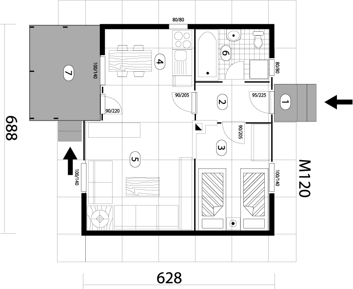 Tip 44b je model iz kategorije manjih površina, do 50m2. Sastoji se iz prostrane dnevne sobe, prostrane spavaće sobe, kupatila, predsoblja i terase.