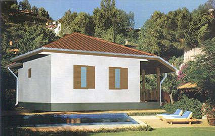 Montažna kuća Tip 66, idealan je za porodicu sa jednom ili dvoje dece. 2 spavaće sobe, Dnevni boravak, kuhinja, ostava, kupatilo i mala terasa.